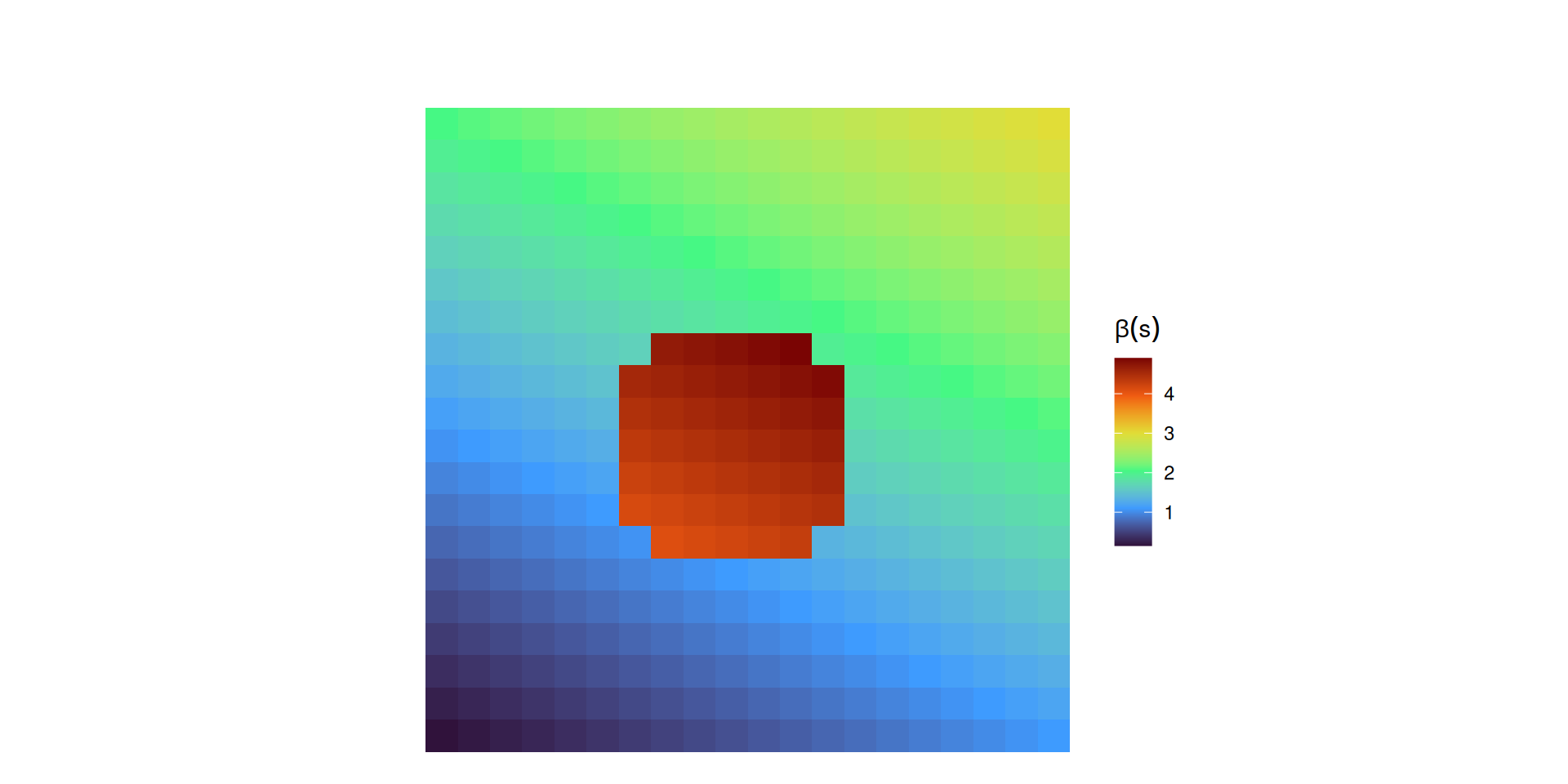 Figura 4: Heterogeneidade Espacial: O efeito de X em Y não é constante (\(\beta(s)\) muda gradualmente e abruptamente no centro)