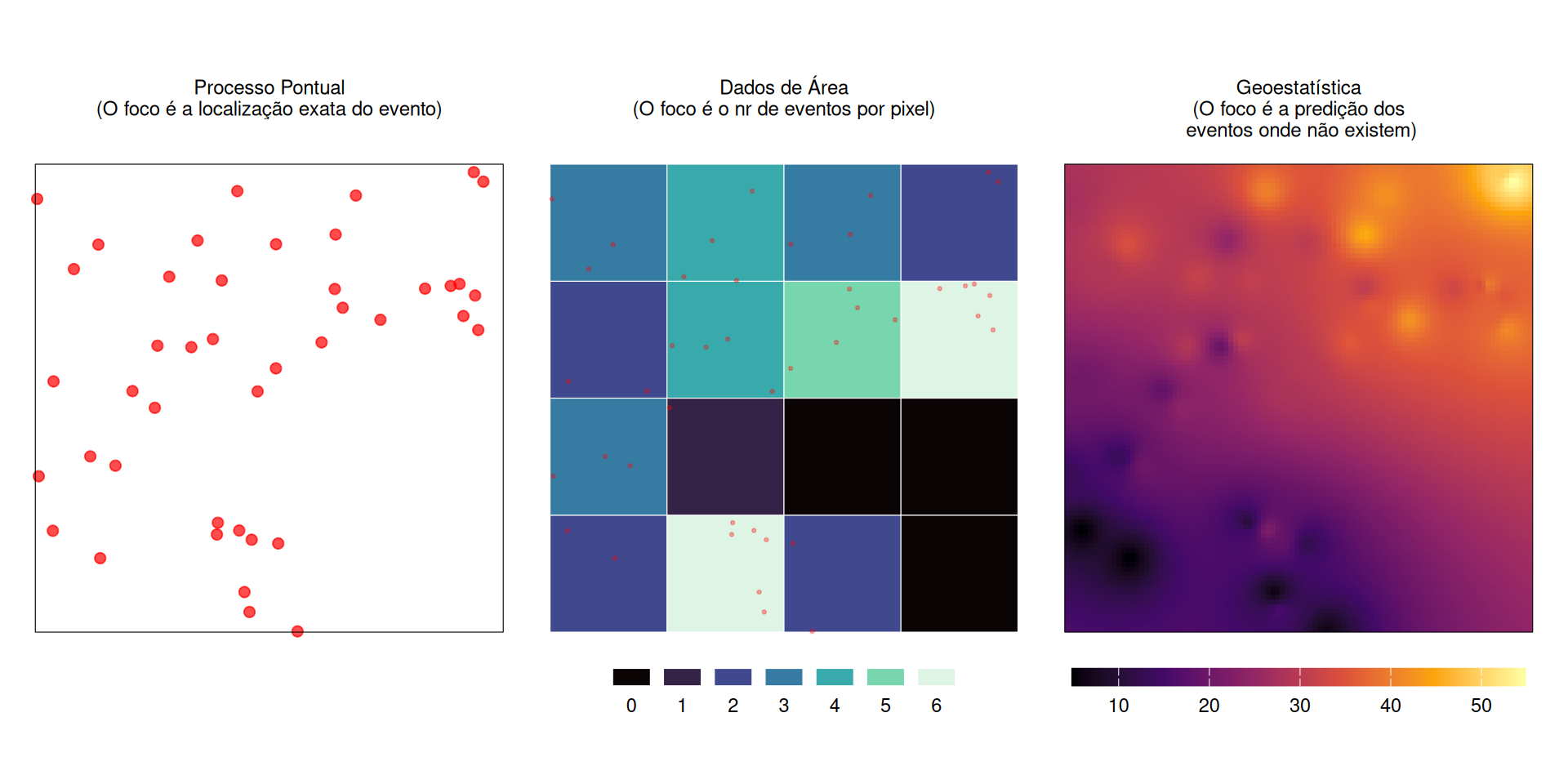Heterogeneidade: Como as estimativas dos parâmetros mudam (\(\beta_{\text{do centro}} \neq \beta_{\text{da periferia}}\)), e/ou não são constantes em toda a área de estudo Figura 4.
