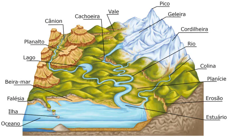Nela existem montanhas, vales, rios e oceanos.