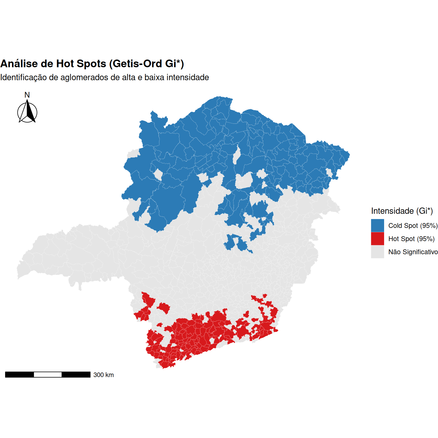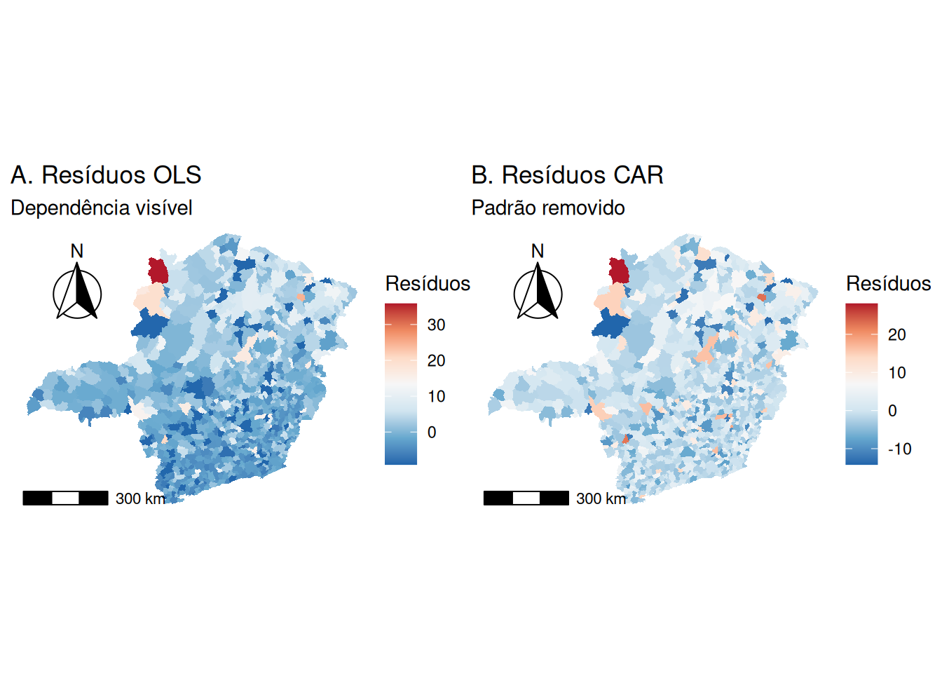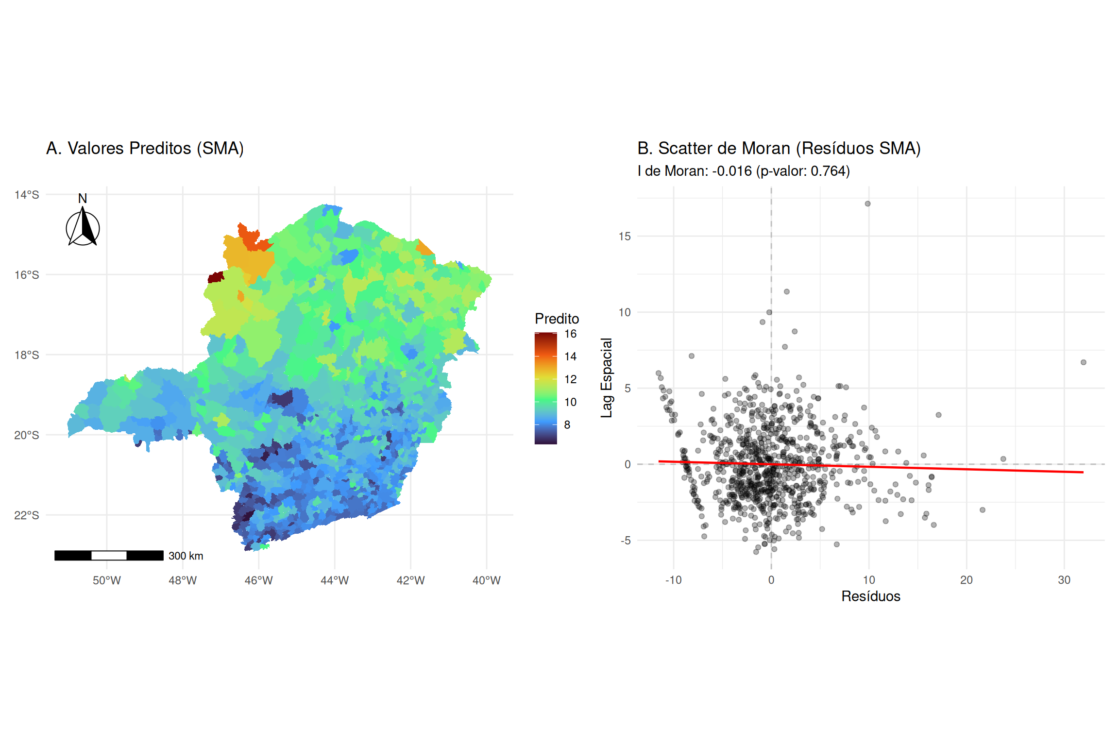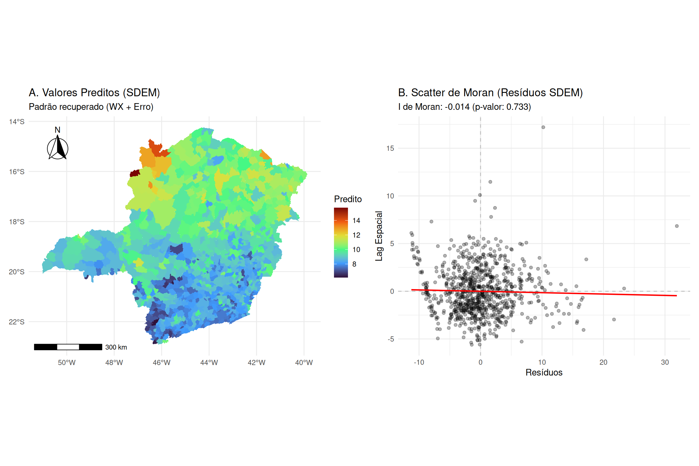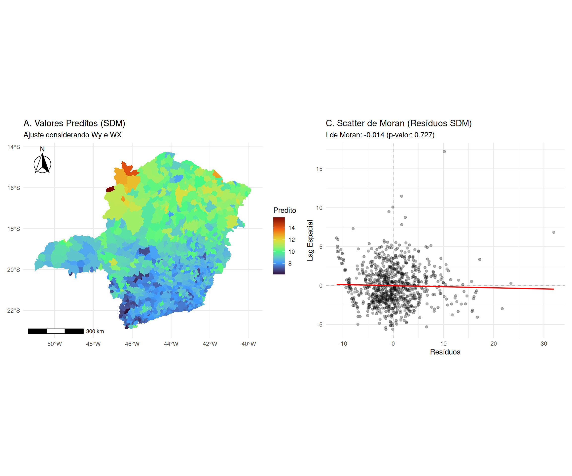 onde \(\mathbf{C} = [\text{diag}(\mathbf{X}_j)]^{-1}\mathbf{R}_j\) e \(\mathbf{R}_j\) é a matriz de projeção específica da covariável. Isso permite o cálculo de erros-padrão locais precisos e o ajuste dos valores críticos da distribuição \(t\) para evitar falsos positivos, garantindo que a heterogeneidade espacial detectada seja estatisticamente significante e não apenas ruído aleatório.