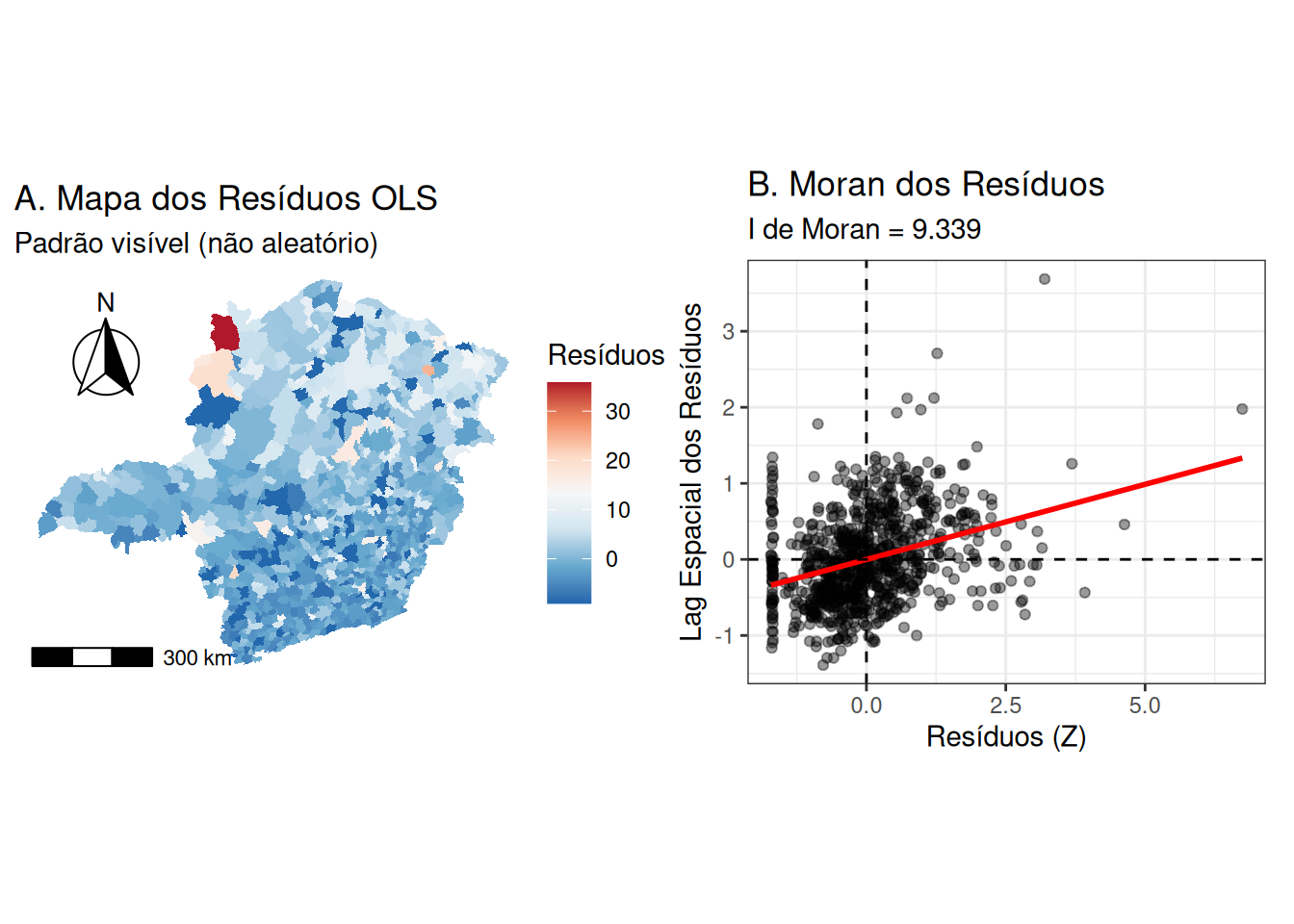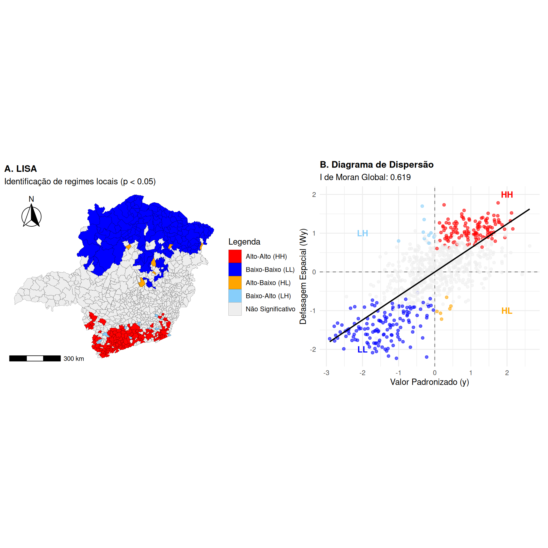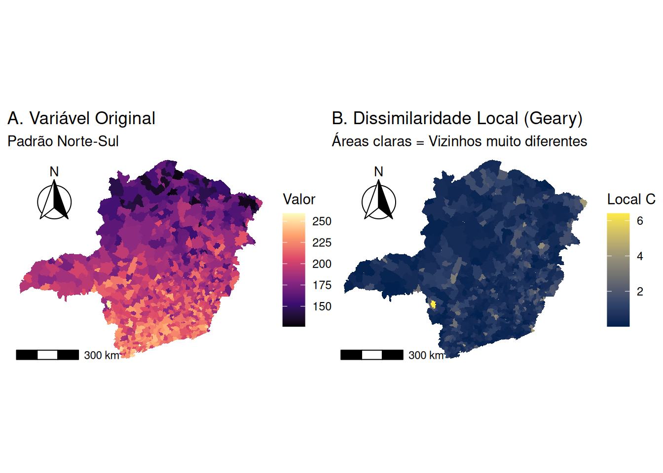 Indução de assimetria: Uma matriz de contiguidade ou distância é frequentemente simétrica (\(w_{ij} = w_{ji}\)). A normalização por linha gera uma matriz assimétrica (\(w_{ij}^{r} \neq w_{ji}^{r}\)), o que pode ser contra-intuitivo para noções de vizinhança e complica a interpretação em alguns modelos.