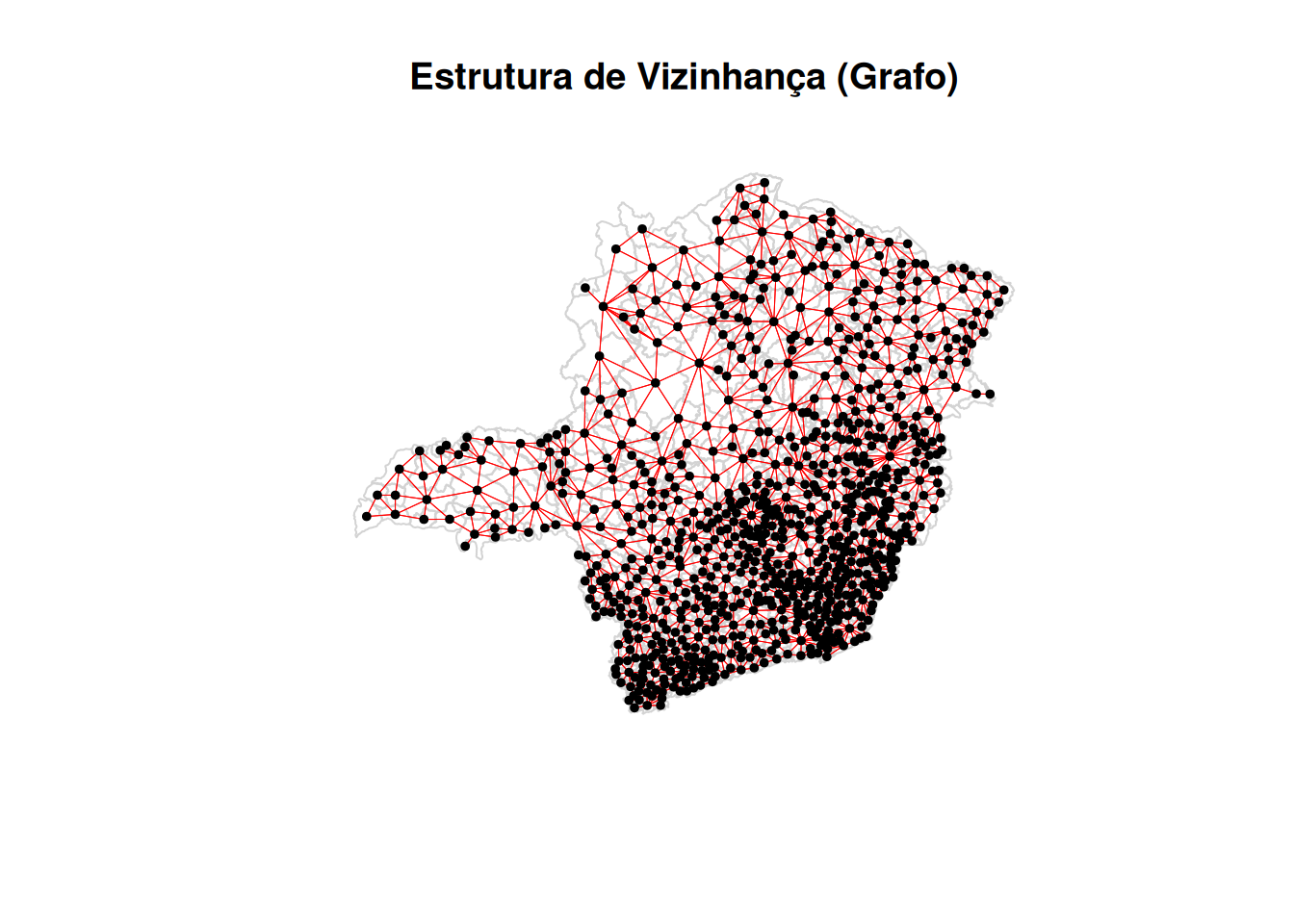onde cada elemento \(w_{ij}\) quantifica a conexão espacial entre a unidade \(j\) e unidade \(i\). Por convenção, assume-se que \(w_{ii} = 0\), impedindo que uma unidade seja vizinha de si [@anselin2001spatial]. Note ainda que é comum descrever a vizinhança entre unidades \(i\) e \(j\) se existe, simplesmente \(i\sim j\), para referir que \(w_{ij} \neq 0\)[@BesagKooperberg1995].