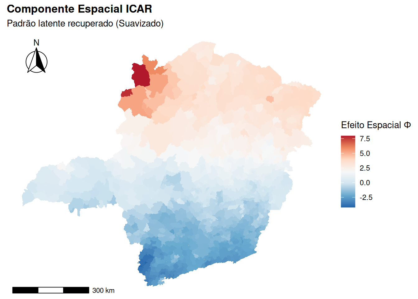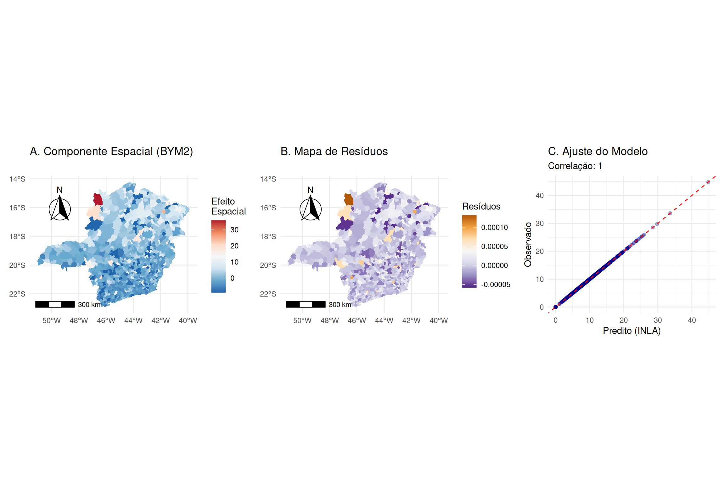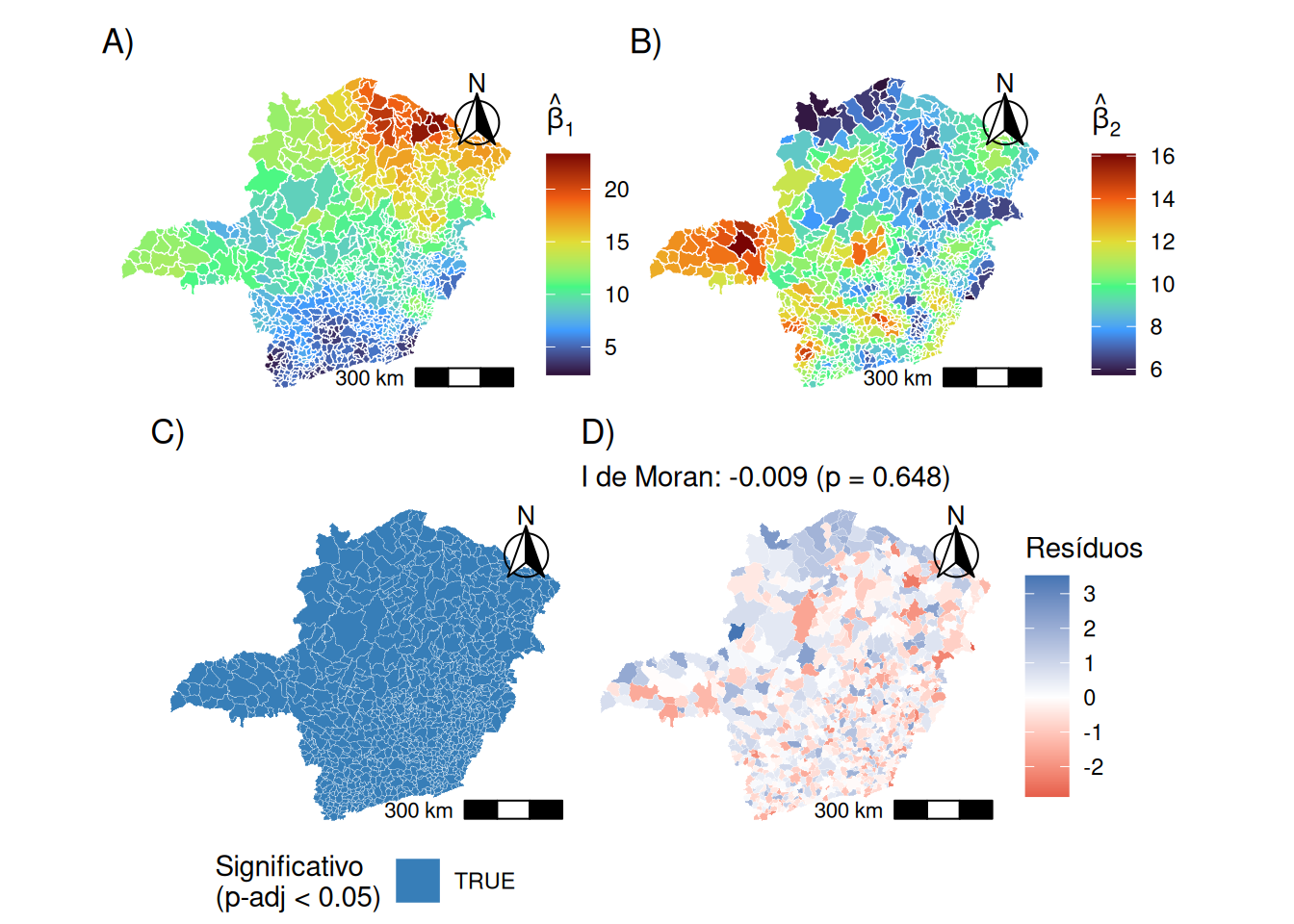 Este formalismo permite a construção de estatísticas \(t\) locais (\(t_{ij} = \hat{\beta}_{ij} / SE(\hat{\beta}_{ij})\)). Contudo, a realização de testes individuais para cada localização incorre no problema de comparações múltiplas. Para mitigar o aumento da taxa de erro tipo I sem a severidade excessiva da correção de Bonferroni, @dasilva2016multiple propõem o ajuste do nível de significância \(\alpha\) baseando-se no número efetivo de parâmetros (\(\text{ENP}_j = \text{tr}(\mathbf{R}_j)\)) específico de cada covariável, garantindo que a heterogeneidade espacial detectada seja estatisticamente significativa.
