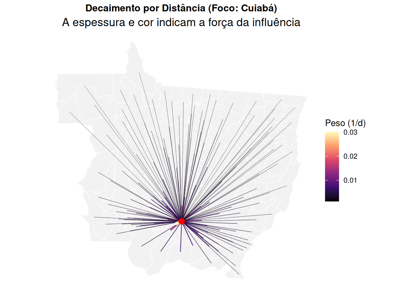 # Identificar Cuiabáid_cuiaba <-which(mt_sf$name_muni =="Cuiabá")# Calcular distâncias de Cuiabá para TODOS os outros municípiosnb_all <-dnearneigh(coords_proj, 0, 900000) # Raio grande para pegar quase todo estadodists <-nbdists(nb_all, coords_proj)# Calcular Pesos (Inverso da Distância: 1/d)weights_list <-lapply(dists, function(x) 1/(x/1000)) # /1000 para km# Preparar dados apenas para Cuiabá para visualizaçãovizinhos_cuiaba <- nb_all[[id_cuiaba]]pesos_cuiaba <- weights_list[[id_cuiaba]]# Criar linhas saindo de Cuiabálines_cuiaba <-vector("list", length(vizinhos_cuiaba))for(i inseq_along(vizinhos_cuiaba)) { dest_idx <- vizinhos_cuiaba[i] lines_cuiaba[[i]] <-st_linestring(rbind(coords_proj[id_cuiaba,], coords_proj[dest_idx,]))}sf_decay <-st_sf(peso = pesos_cuiaba, geometry =st_sfc(lines_cuiaba), crs =5880)ggplot() +geom_sf(data = mt_proj, fill ="gray95", color ="white") +geom_sf(data = sf_decay, aes(color = peso, linewidth = peso), alpha =0.8) +geom_point(aes(x=coords_proj[id_cuiaba,1], y=coords_proj[id_cuiaba,2]), color="red", size=3) +scale_color_viridis_c(option ="magma", name ="Peso (1/d)") +scale_linewidth(range =c(0.1, 2), guide ="none") +labs(title ="Decaimento por Distância (Foco: Cuiabá)",subtitle ="A espessura e cor indicam a força da influência") + theme_map