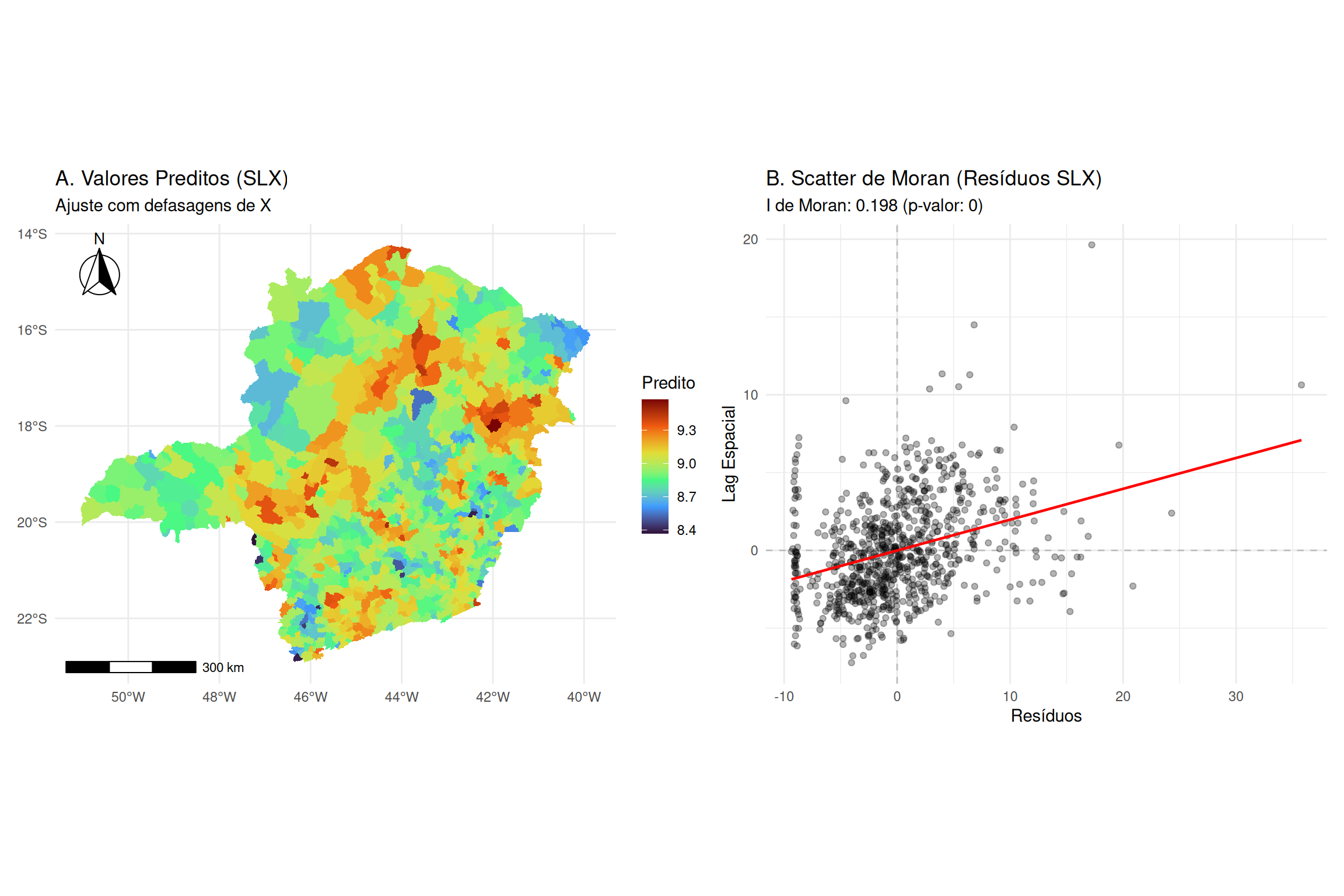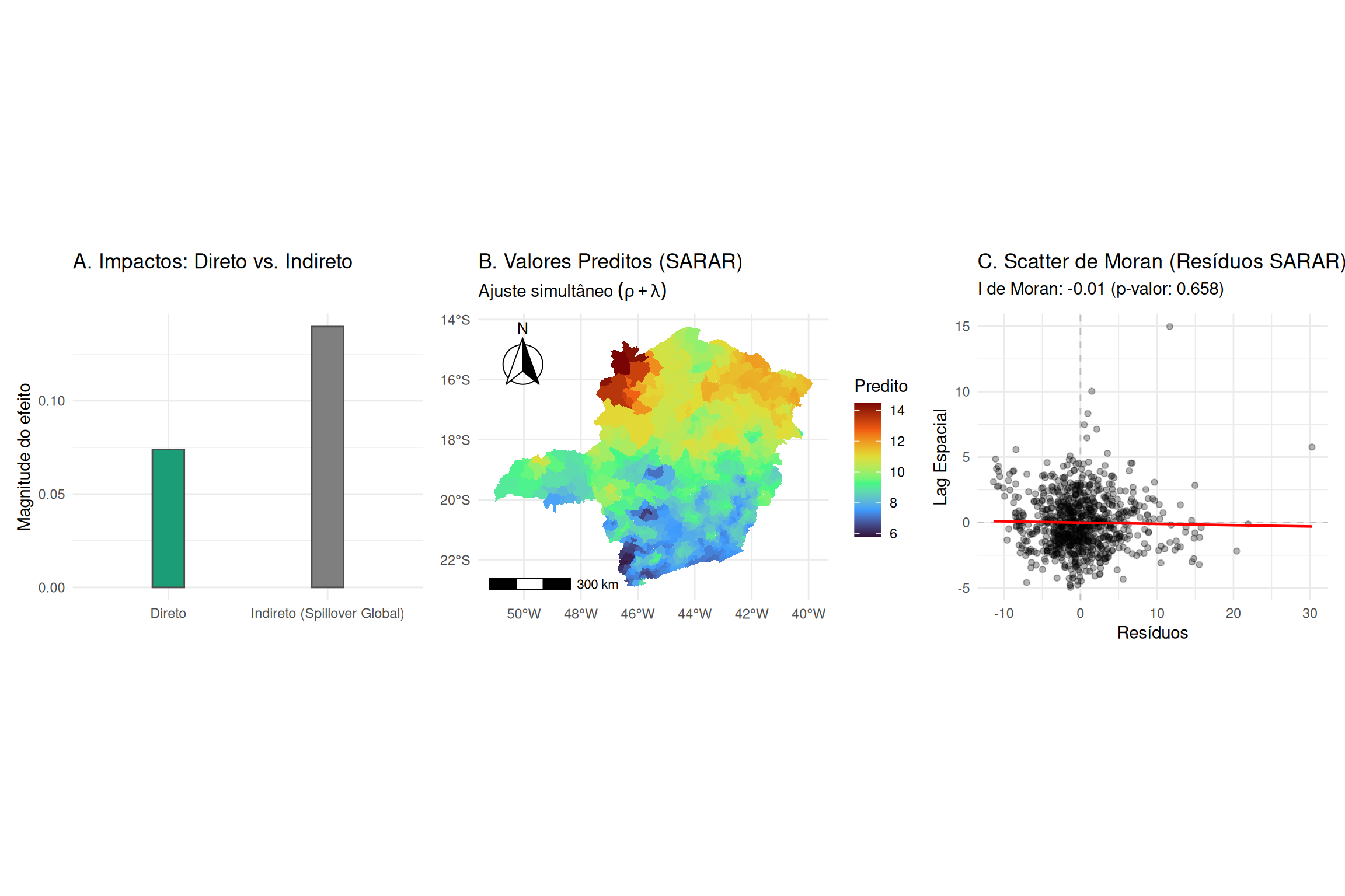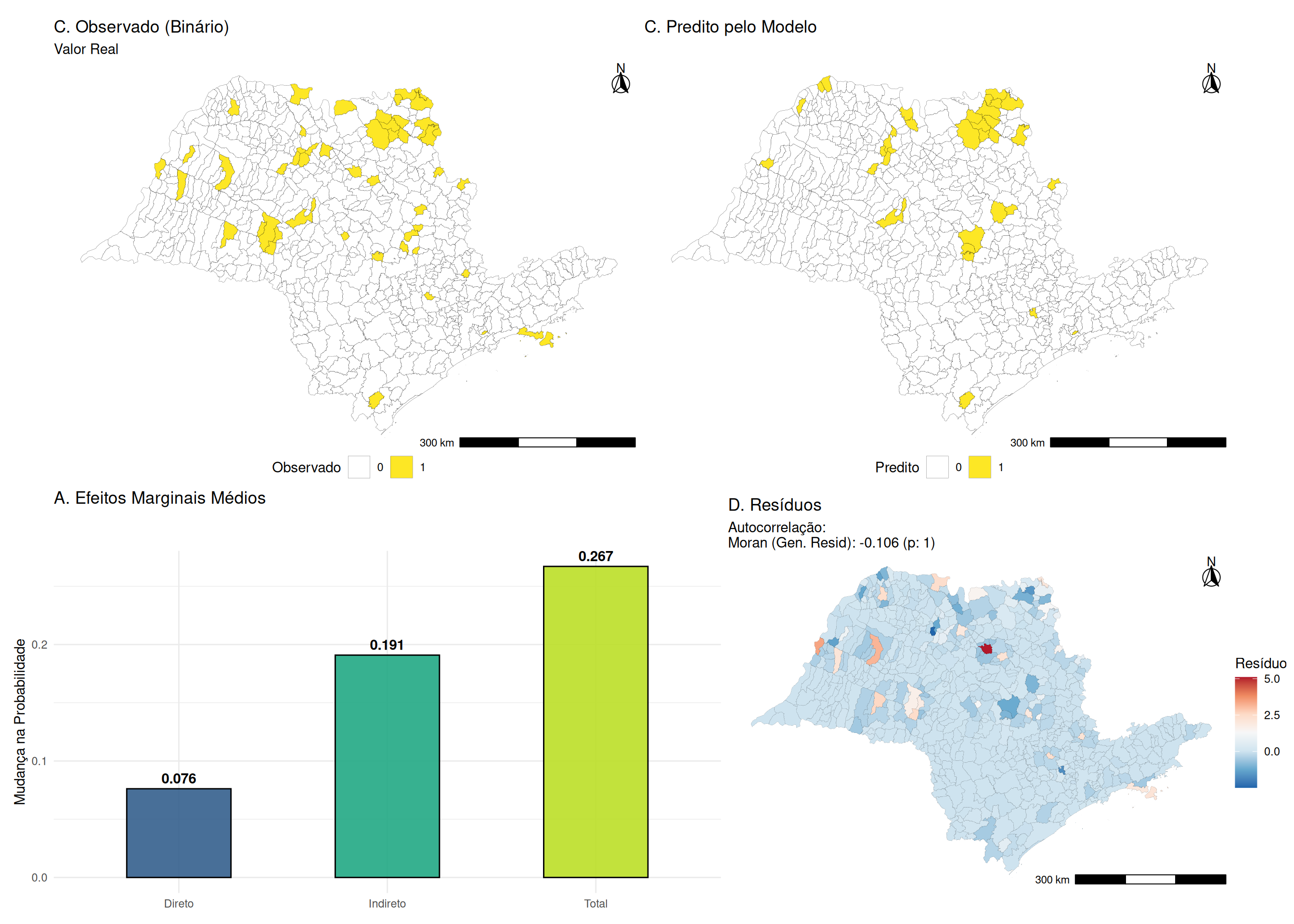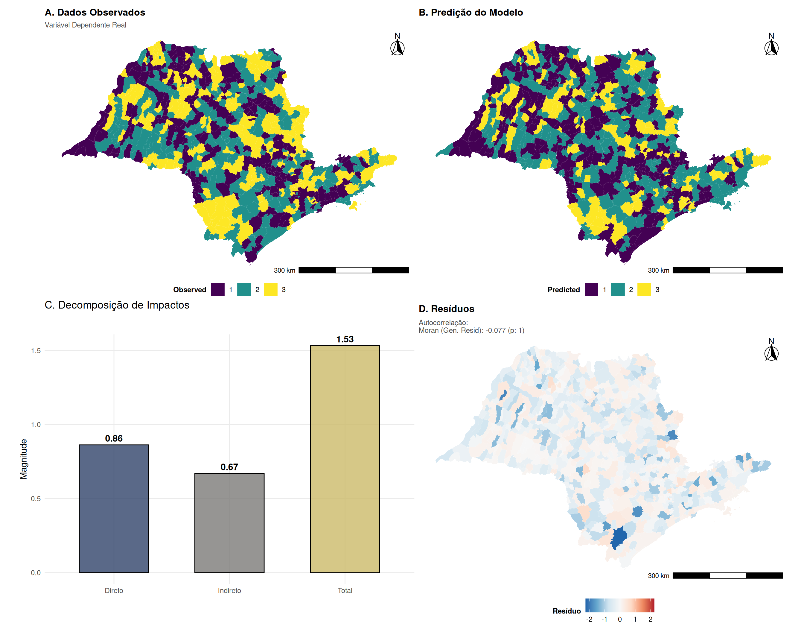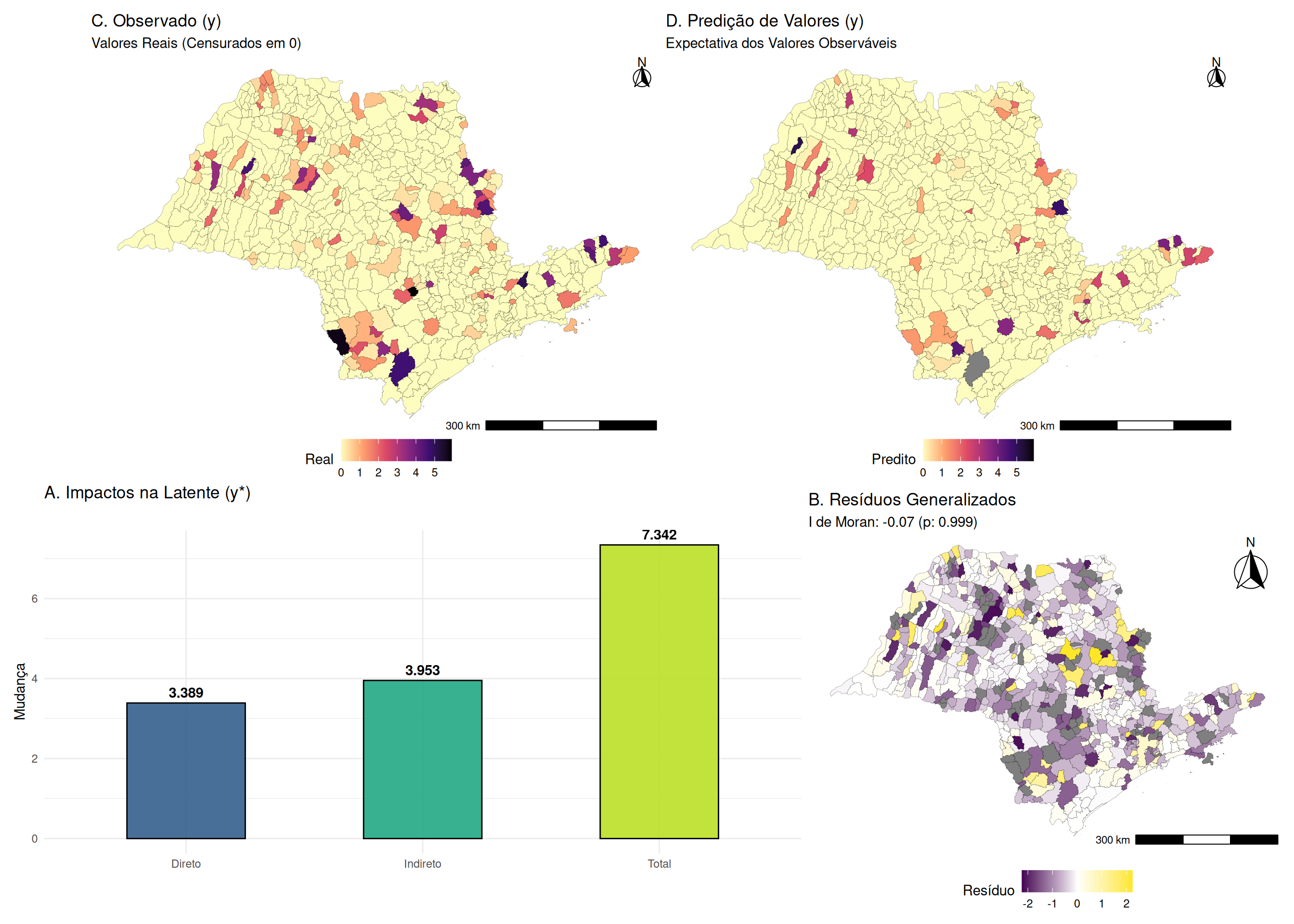 Estes efeitos são calculados a partir das derivadas parciais de \(E[\mathbf{y} | \mathbf{X}]\) em relação a \(\mathbf{x}_k\), que envolvem a matriz \((\mathbf{I}_n - \rho \mathbf{W})^{-1}\) e os termos da função de distribuição normal associados à probabilidade de censura. Como variam entre observações, a prática padrão é reportar suas médias amostrais.