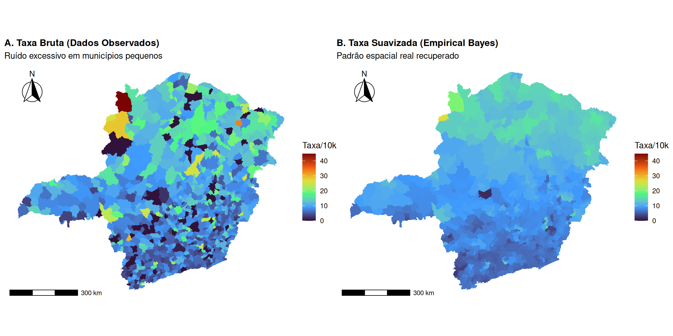 A representação dos dados de área pode se dar em estruturas regulares (grelhas ou grids) ou irregulares (divisões políticas ou administrativas, ?@sec-grid). Grids regulares são comuns em análise de imagens, sensoriamento remoto e dados climáticos, onde cada célula (pixel) tem uma forma e tamanho constantes, facilitando a computação e a definição de vizinhança. Polígonos irregulares, que representam entidades como municípios ou distritos, são comuns em ciências sociais e saúde pública. A heterogeneidade no tamanho e forma dessas regiões introduz desafios adicionais, como a já mencionada variância desigual e a definição não trivial de proximidade [@cressie1989spatial].