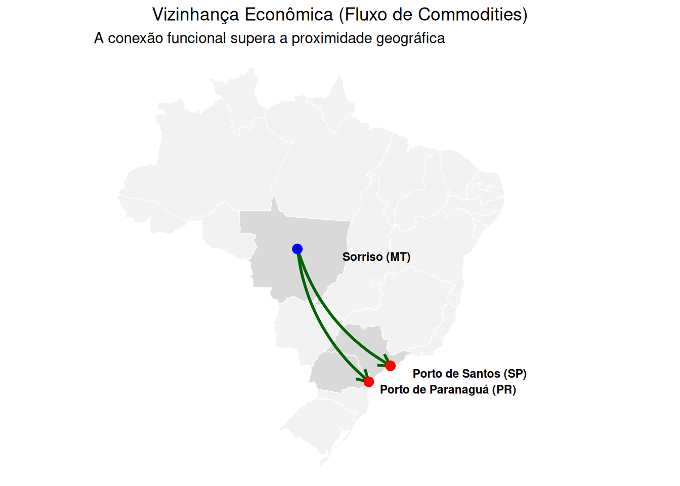 # Carregar mapa do Brasil (Estados)br_states <-read_state(year =2020, showProgress =FALSE)# Coordenadas aproximadas das cidades de interesse# (Sorriso-MT, Santos-SP, Paranaguá-PR)cidades_df <-data.frame(cidade =c("Sorriso (MT)", "Porto de Santos (SP)", "Porto de Paranaguá (PR)"),lat =c(-12.5427, -23.9618, -25.5205),lon =c(-55.7211, -46.3322, -48.5095),tipo =c("Origem", "Destino", "Destino"))cidades_sf <-st_as_sf(cidades_df, coords =c("lon", "lat"), crs =4326)# Criar conexões (Arcos)sorriso_coords <-subset(cidades_df, cidade =="Sorriso (MT)")destinos <-subset(cidades_df, tipo =="Destino")conexoes <-lapply(1:nrow(destinos), function(i) {st_linestring(rbind(c(sorriso_coords$lon, sorriso_coords$lat),c(destinos$lon[i], destinos$lat[i]) ))})conexoes_sf <-st_sf(geometry =st_sfc(conexoes), crs =4326)# Plotggplot() +geom_sf(data = br_states, fill ="gray95", color ="white") +# Destacar Estados envolvidosgeom_sf(data =subset(br_states, abbrev_state %in%c("MT", "SP", "PR")), fill ="gray85", color ="white") +# Linhas de Fluxo (Curvas para indicar movimento/distância)geom_curve(data =data.frame(x1 = sorriso_coords$lon, y1 = sorriso_coords$lat,x2 = destinos$lon, y2 = destinos$lat),aes(x = x1, y = y1, xend = x2, yend = y2),color ="darkgreen", size =1, curvature =0.2, arrow =arrow(length =unit(0.03, "npc"))) +geom_point(data = cidades_df, aes(x = lon, y = lat, color = tipo), size =3) +scale_color_manual(values =c("red", "blue")) +geom_text(data = cidades_df, aes(x = lon, y = lat, label = cidade), vjust =-1, fontface ="bold", size =3, nudge_x=8, nudge_y=-2) +#usei nudge pra mover legendalabs(title ="Vizinhança Econômica (Fluxo de Commodities)",subtitle ="A conexão funcional supera a proximidade geográfica") +theme_void() +theme(legend.position ="none", plot.title =element_text(hjust =0.5))