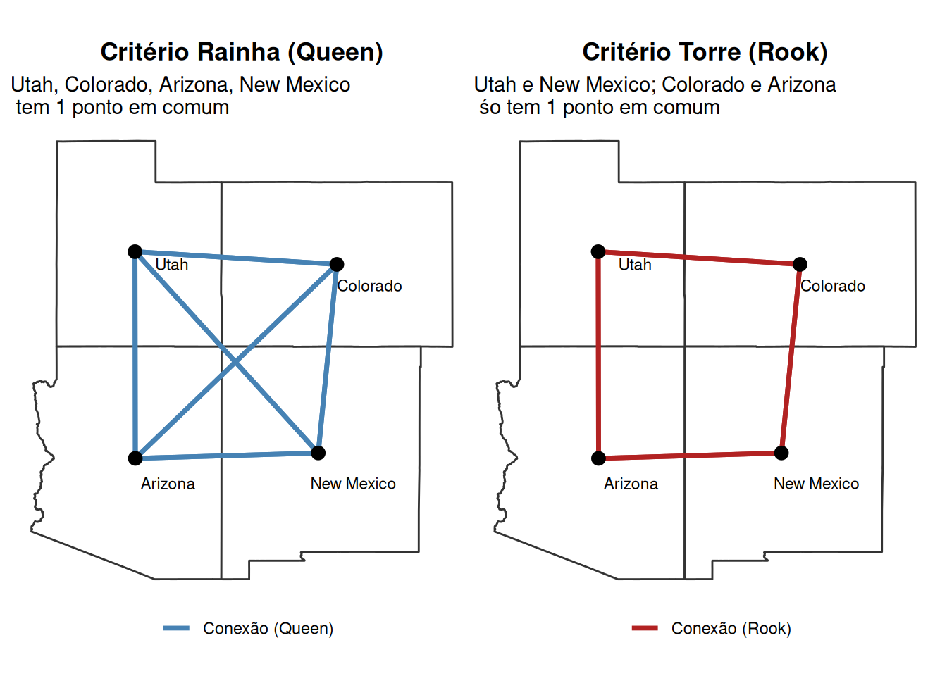 if (!require("pacman")) install.packages("pacman")pacman::p_load(sf, spdep, ggplot2, patchwork, dplyr, geodata)# Baixar dados dos EUA (Nível 1 = Estados)usa_sf <-tryCatch({# Tenta baixar direto usa_vect <- geodata::gadm(country ="USA", level =1, path =tempdir(), version="latest") sf::st_as_sf(usa_vect)}, error =function(e) {message("Erro ao baixar dados, gadm está com problemas, baixa direto no site: https://gadm.org/maps.html.")})# FILTRAR apenas Utah, Colorado, Arizona, New Mexicofour_corners <- usa_sf %>%filter(NAME_1 %in%c("Utah", "Colorado", "Arizona", "New Mexico")) %>%st_make_valid()# Extrair centroides para o grafocoords <-suppressWarnings(st_coordinates(st_centroid(four_corners))) #suppressWarnings() era para tirarcoords_df <-as.data.frame(coords)# Queen (Rainha)#identificar quais polígonos são vizinhos e constroir lista de vizinhosnb_queen <-poly2nb(four_corners, queen =TRUE)#criar segmentos de reta ligando os centroides das áreas vizinhasnb_lines_queen <-nb2lines(nb_queen, coords = coords, as_sf =TRUE)st_crs(nb_lines_queen) <-st_crs(four_corners) # atribuir a nb_lines_queen CRS igual do four_corners# Rook (Torre)nb_rook <-poly2nb(four_corners, queen =FALSE)nb_lines_rook <-nb2lines(nb_rook, coords = coords, as_sf =TRUE)st_crs(nb_lines_rook) <-st_crs(four_corners)theme_comp <-theme_void() +theme(plot.title =element_text(hjust =0.5, face ="bold"),legend.position ="bottom")+theme(legedn.title=element_text(hjust=0.5))# Queenp_queen <-ggplot() +geom_sf(data = four_corners, fill ="white", color ="gray20", linewidth =0.5) +geom_sf(data = nb_lines_queen, aes(color ="Conexão (Queen)"), linewidth =1.2) +geom_point(data = coords_df, aes(X, Y), size =3) +geom_sf_text(data = four_corners, aes(label = NAME_1), size =3, nudge_y =-0.5, nudge_x=1) +scale_color_manual(values ="steelblue", name ="") +labs(title ="Critério Rainha (Queen)", subtitle ="Utah, Colorado, Arizona, New Mexico\n tem 1 ponto em comum") + theme_comp# Rookp_rook <-ggplot() +geom_sf(data = four_corners, fill ="white", color ="gray20", linewidth =0.5) +geom_sf(data = nb_lines_rook, aes(color ="Conexão (Rook)"), linewidth =1.2) +geom_point(data = coords_df, aes(X, Y), size =3) +geom_sf_text(data = four_corners, aes(label = NAME_1), size =3, nudge_y =-0.5, nudge_x=1) +scale_color_manual(values ="firebrick", name ="") +labs(title ="Critério Torre (Rook)", subtitle ="Utah e New Mexico; Colorado e Arizona\n śo tem 1 ponto em comum") + theme_compp_queen + p_rook