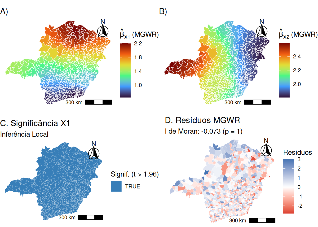 A principal inovação da MGWR é a capacidade de interpretar as larguras de banda \(bw_j\) como métricas da escala espacial de cada processo. Baseando-se na teoria desenvolvida por @fotheringham2022notion, pode-se inferir que: